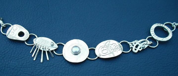 This piece was commissioned for the niece of my client. They wanted to give her something that would remind her of Ireland, the homeland of her parents. Each section of the bracelet is inspired by an artefact from a different period in Irish history; a Neolithic stone head, a Bronze Age gold boat, an Iron Age gold sun disc, the manuscripts of the early Medieval period, a Viking dragon and a Medieval brooch. It is hand forged from sterling silver and set with natural pearls.