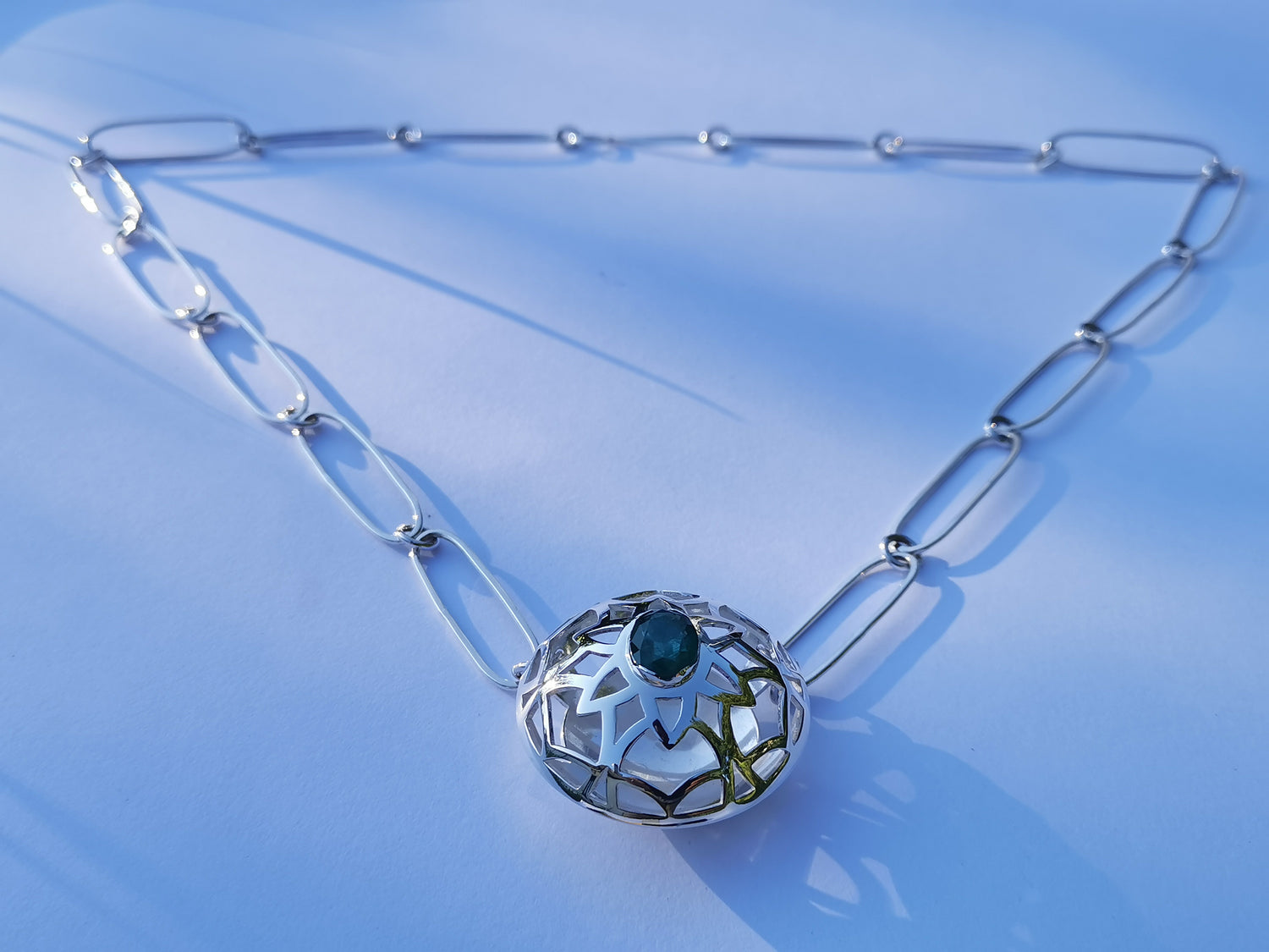 I created this impressive sterling silver necklace to showcase my client's large emerald. The fretwork setting allows light to shine through all sides of the stone, flooding it with internal light. The pattern was inspired by 15th Century Moorish decorative motifs. This intricate detail was hand cut and the chain is hand forged.
