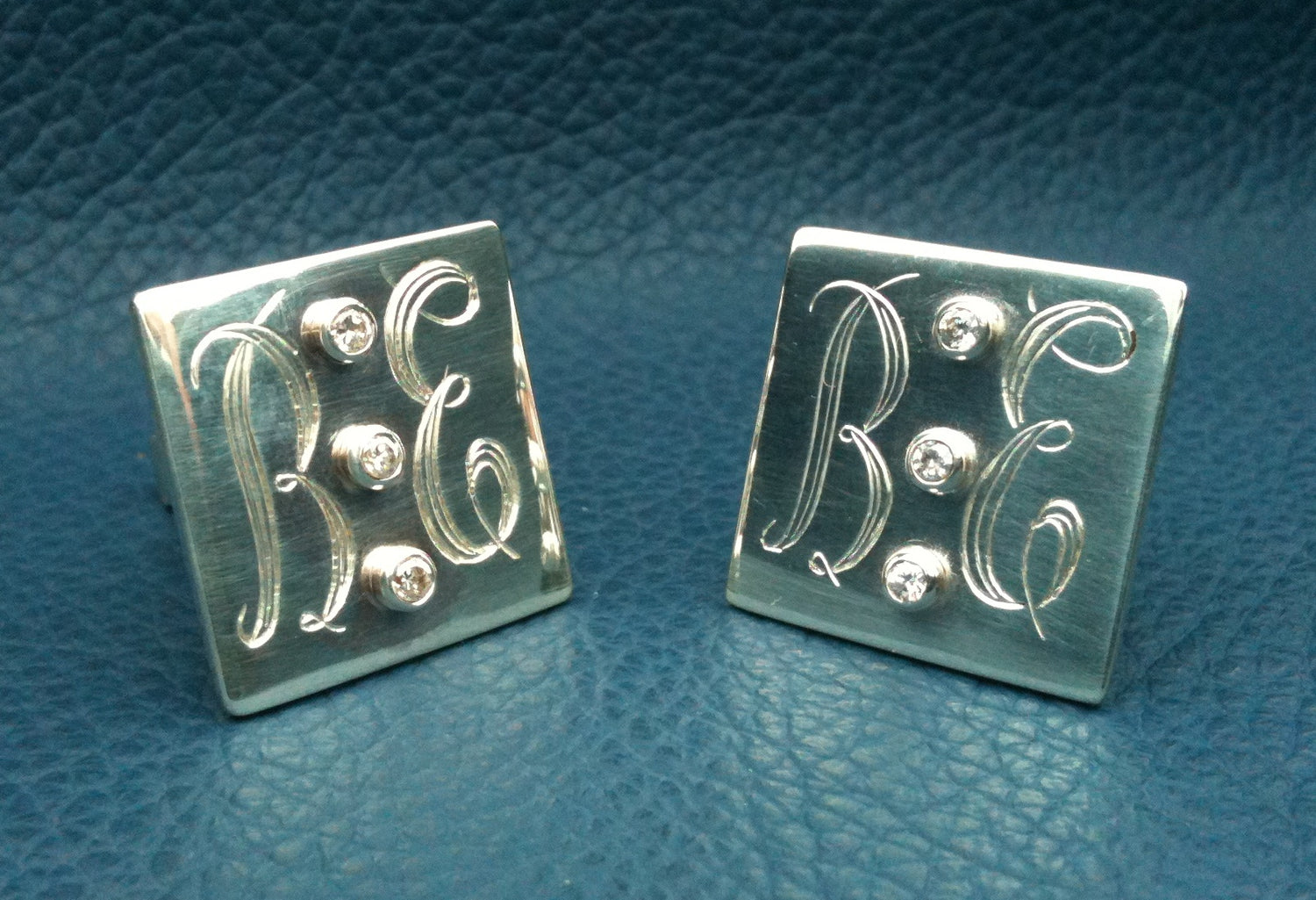 These sterling silver cufflinks were commissioned by my client to mark a significant birthday for her husband. As he is a stylish but classical type of man, we decided on hand engraved Georgian lettering and some tube set diamonds. Simple and elegant.