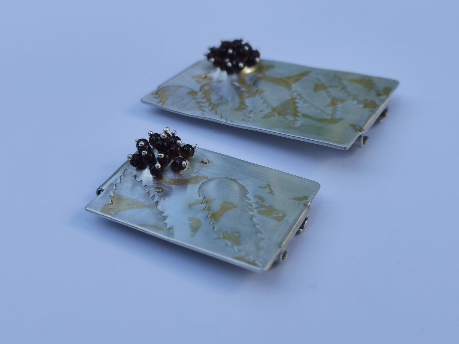 These silver brooches were commissioned by my client to mark the birth of their friends' new baby boy, Rowan. They wanted a special gift for each parent, so I designed His and Hers brooches which feature an impressed rowan leaf pattern. They are decorated with hand fused gold details and set with clusters of garnet beads to resemble bunches of rowan berries.